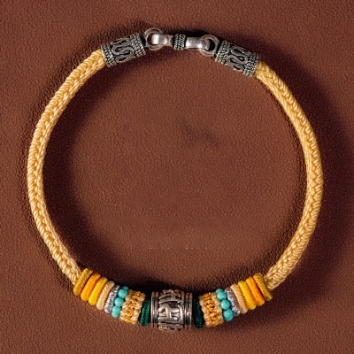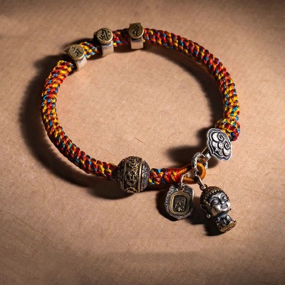 Handmade Tibetan 925 Sterling Silver Chinese Zodiac Natal Buddha Zakiram Goddess of Wealth Protection Multicolored Rope Braided Bracelet