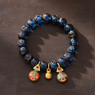 Gold Swallowing Beast Luck Charm Blue Liuli Glass Bead Fortune Bracelet
